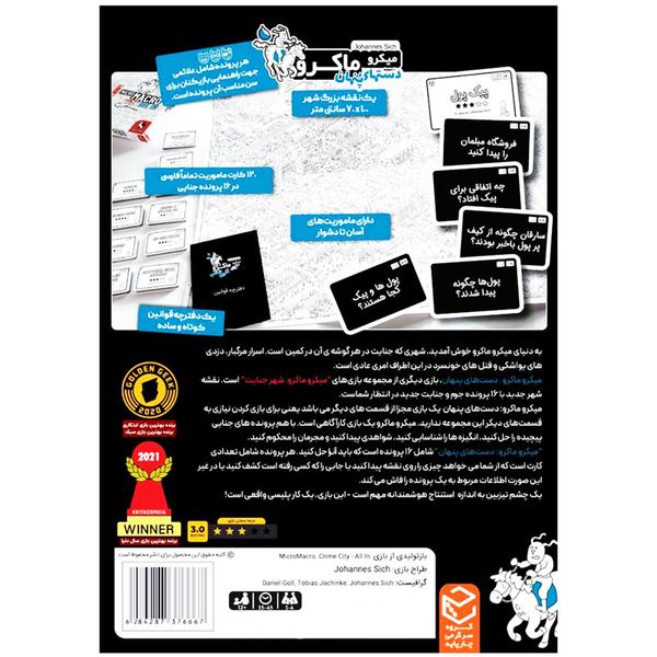 به شهر جنایت خوش آمدید، شهری که جنایت در هر گوشه ی آن در کمین است. اسرار مرگبار، دزدی های یواشکی و قتل های خونسرد در این اطراف امری عادی است. میکرو ماکرو 3، سومین قسمت از مجموعه بازی “میکرو ماکرو: شهر جنایت” است. نقشه شهر جدید با 16 پرونده جرم و جنایت جدید در انتظار شماست. میکرو ماکرو 3 یک بازی مجزا از قسمت اول و دوم می باشد یعنی برای بازی کردن نیازی به قسمت اول و دوم این مجموعه ندارید. میکرو ماکرو یک بازی کارآگاهی است. با هم پرونده های جنایی پیچیده را حل کنید، انگیزه ها را شناسایی کنید، شواهدی پیدا کنید و مجرمان را محکوم کنید. میکروماکرو دستهای پنهان شامل 16 پرونده است که باید آنرا حل کنید. هر پرونده شامل تعدادی کارت است که از شما می خواهد چیزی را روی نقشه پیدا کنید یا جایی را که کسی رفته است کشف کنید یا در غیر این صورت اطلاعات مربوط به یک پرونده را فاش می کند. یک چشم تیزبین به اندازه استنتاج هوشمندانه مهم است ، این بازی، یک کار پلیسی واقعی است. جنایت در سراسر شهر اتفاق افتاده است و شما می خواهید دقیقاً بفهمید چه اتفاقی افتاده است، بنابراین باید به نقشه غول پیکر شهر (70 x 100 سانتی متر) دقت کنید تا تمام اطلاعات پنهان را پیدا کنید و ردپاهای آن را دنبال کنید تا بفهمید مظنونین چگونه شهر را بهم ریخته اند.